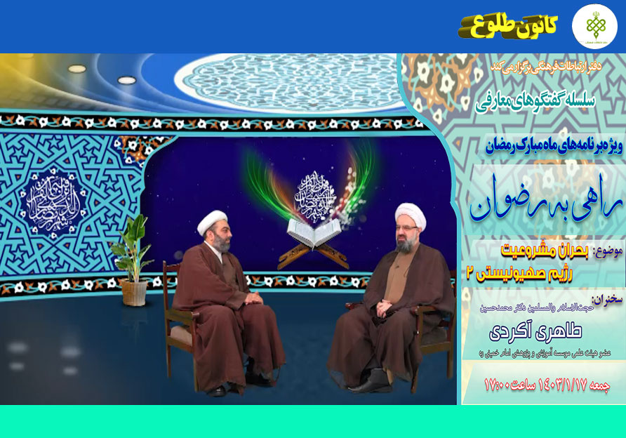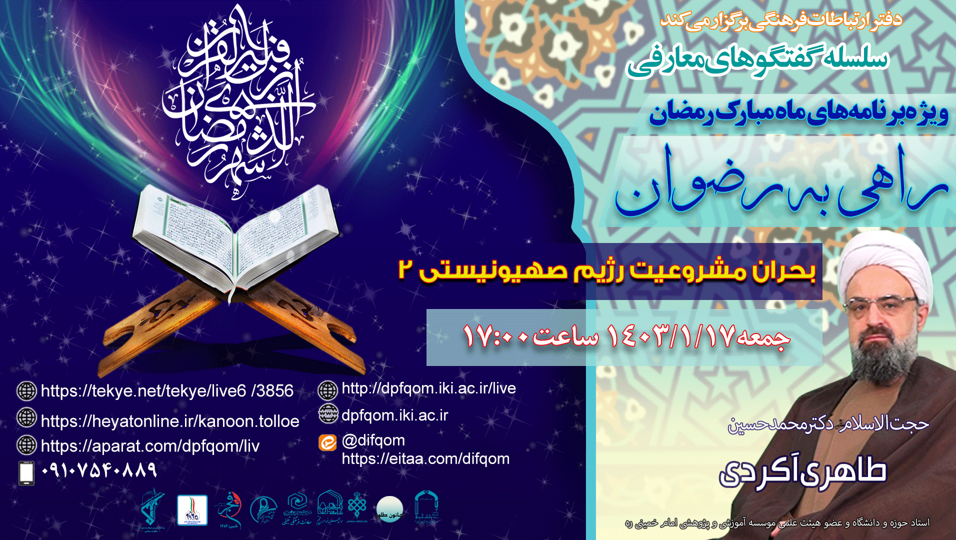 دفتر ارتباطات فرهنگی موسسه امام خمینی(ره) به مناسبت ماه مبارک رمضان سال ۱۴۴۵ ه-ق و روز قدس به تبیین مباحثی پیرامون اهمیت این روز و جایگاه رژیم صهیونیستی پرداخته و به این منظور گفتگویی را تحت عنوان ویژهبرنامههای ماه مبارک رمضان ۱۴۴۵ ارائه نموده است. در این مباحث ضمن تبیین عدم مشروعیت این رژیم، بحران مشروعیت آن بررسی شد. در این قسمت از سلسله مباحث تبیینی، موضوع "بحران مشروعیت رژیم صهیونیستی ۲"، توسط حجتالاسلام دکترمحمدحسین طاهری آکردی مورد بحث قرار گرفته است.