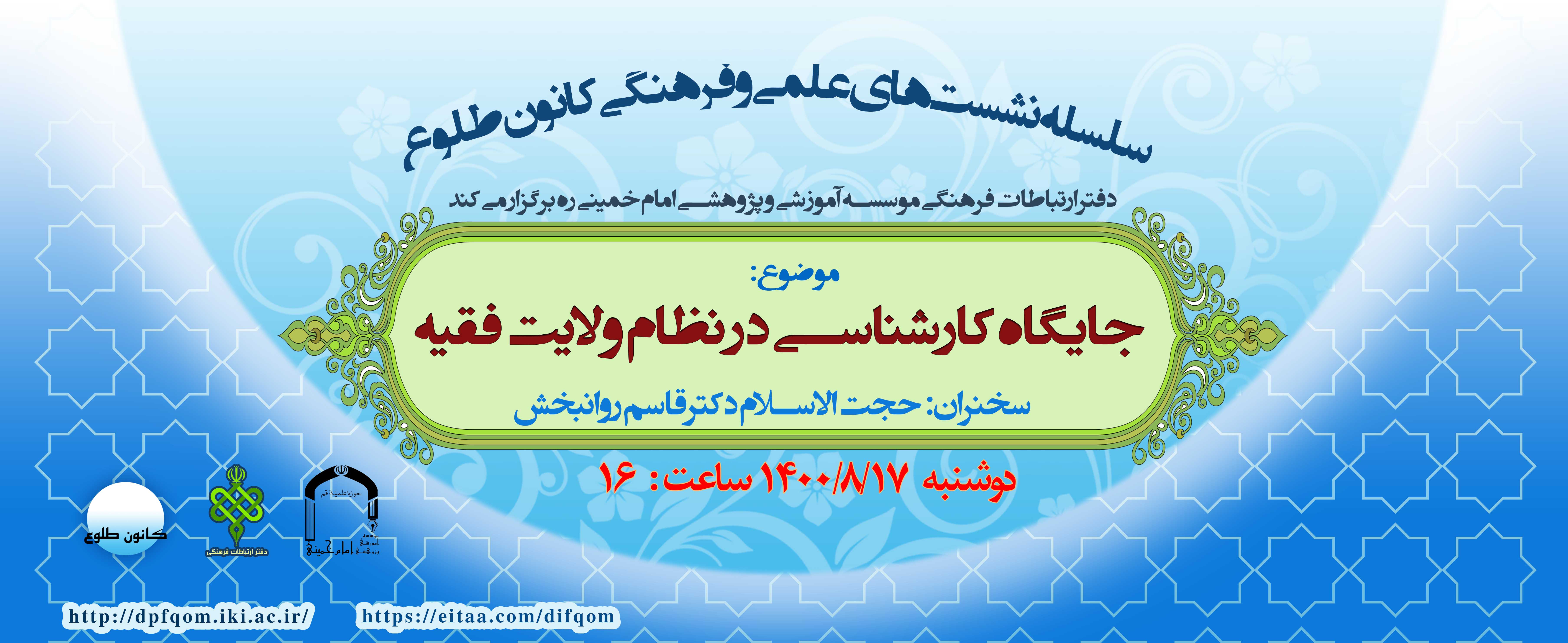 در ادامه اين نشستها، حجتالاسلام و المسلمین دكتر روانبخش، عضو هیئت علمی مؤسسه آموزشی و پژوهشی امام خمینی(ره) موضوع «جايگاه كارشناسي در ولايت فقيه» را مورد بحث و بررسي قرار دادند.