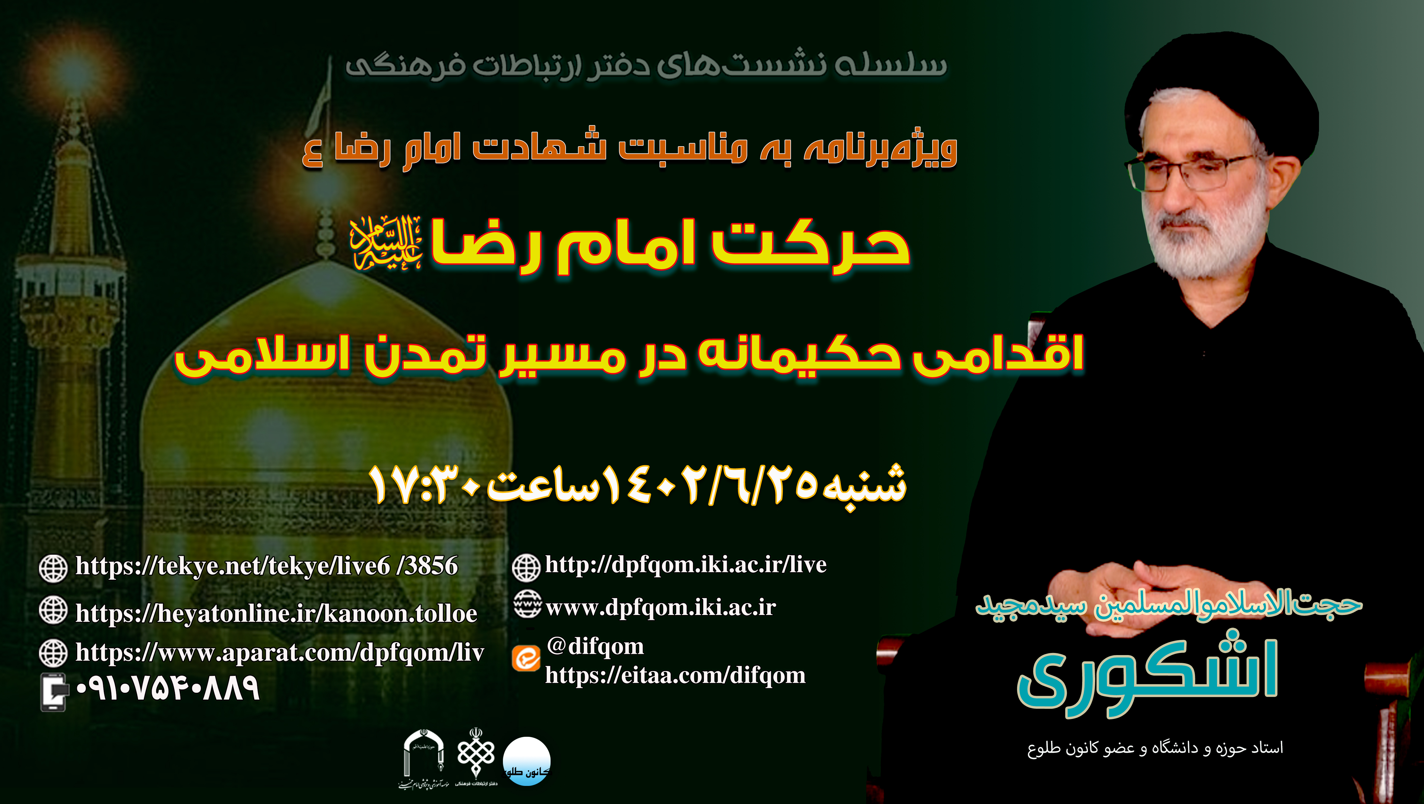حجت الاسلام و المسلمین سیدمجید اشکوری  | حرکت امام رضاع؛ اقدامی حکیمانه در مسیر تمدن اسلامی  | 1402/06/25  | 00:27:05  | ![]()  |