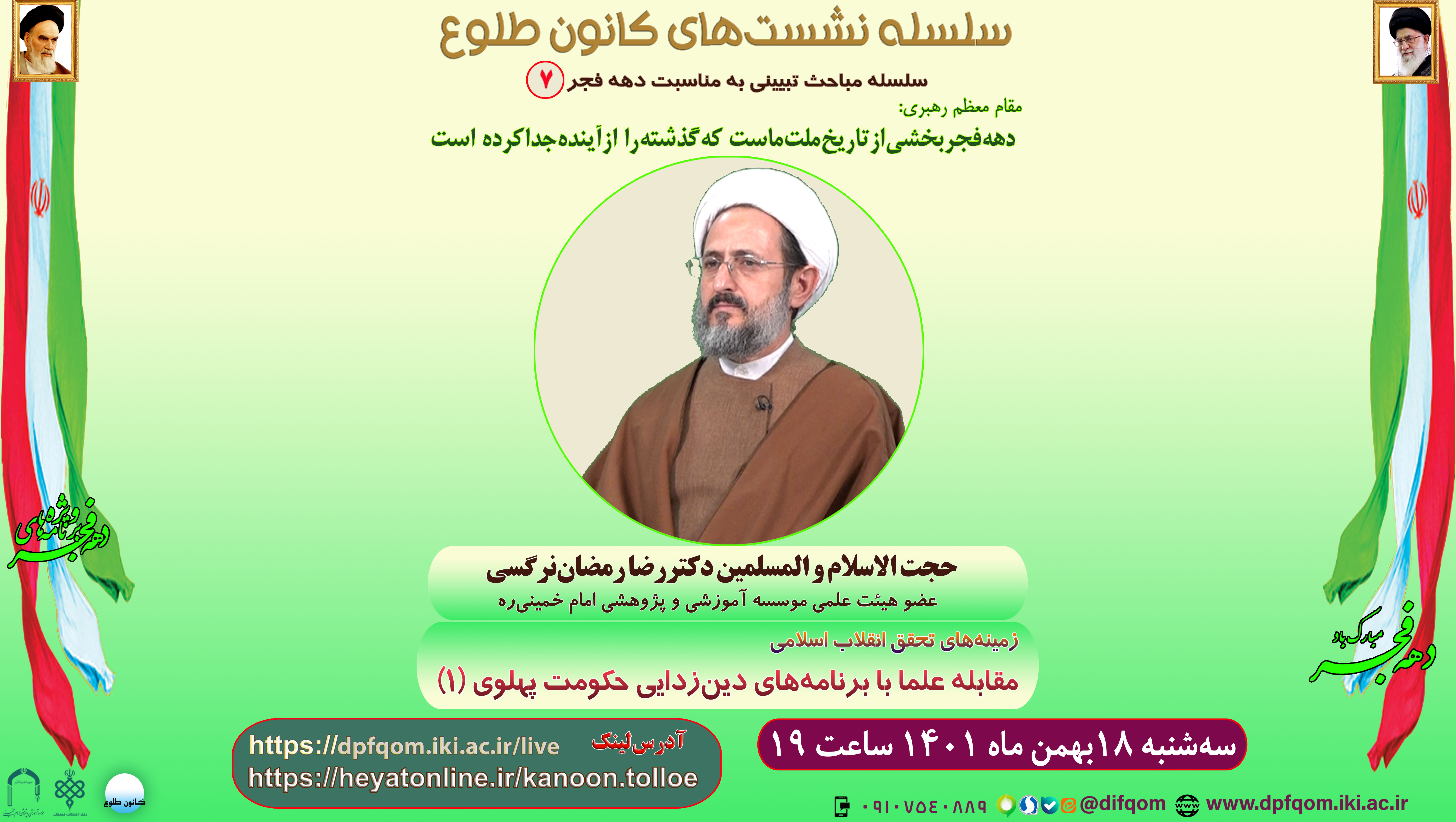 حجتالاسلام والمسلمین دکتررضا رمضاننرگسی  | زمینههای تحقق انقلاب اسلامی مقابله علما با برنامههای دینزدایی حکومت پهلوی قسمت اول  | 1401/11/18  | 00:32:29  | ![]()  |  |
