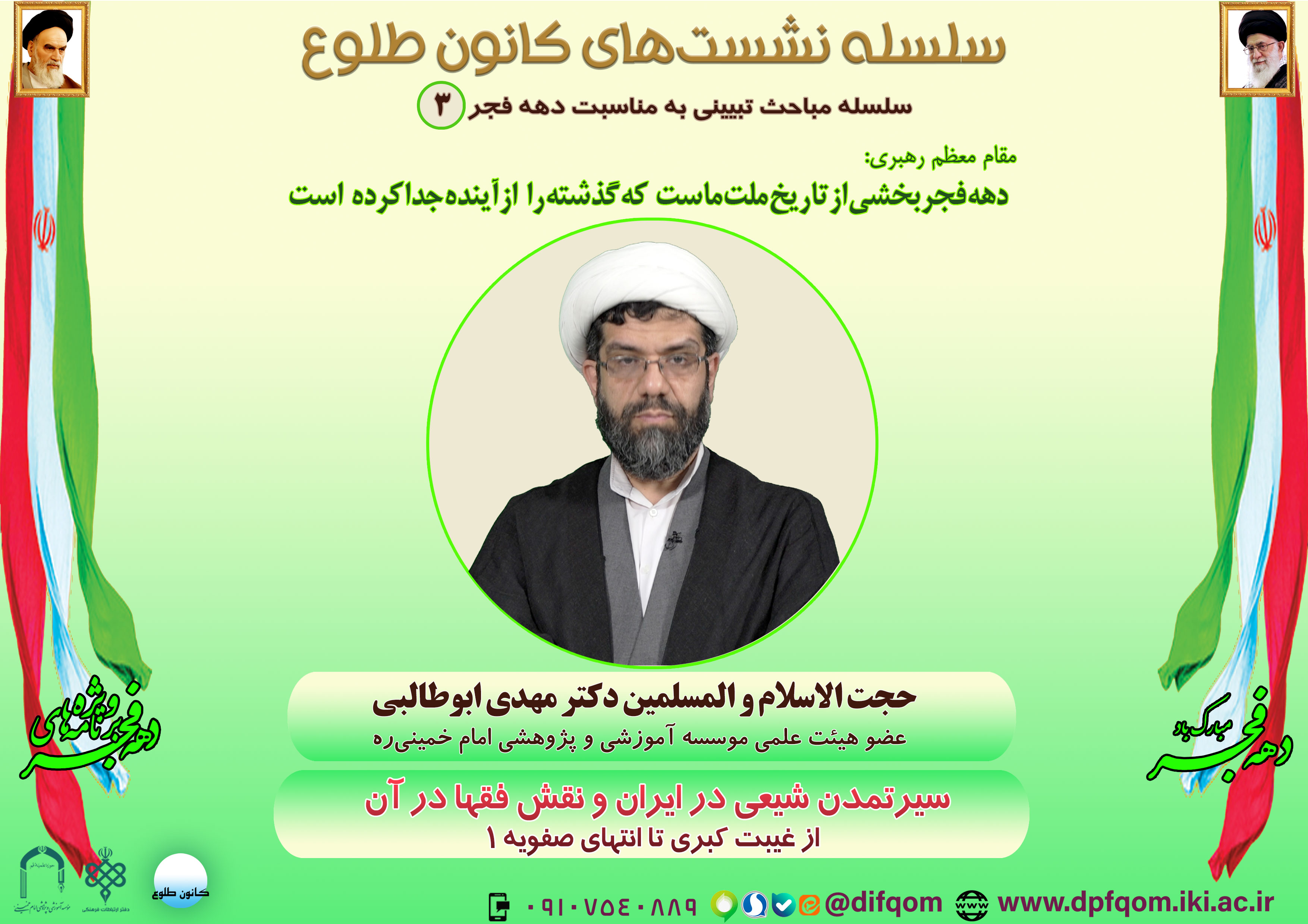 حجتالاسلام والمسلمین دکتر مهدی ابوطالبی  | سیرتمدن شیعی در ایران و نقش فقها در آن (از غیبت کبری تا انتهای صفویه) قسمت اول  | 1401/11/14  | 00:24:19  | ![]()  |  |