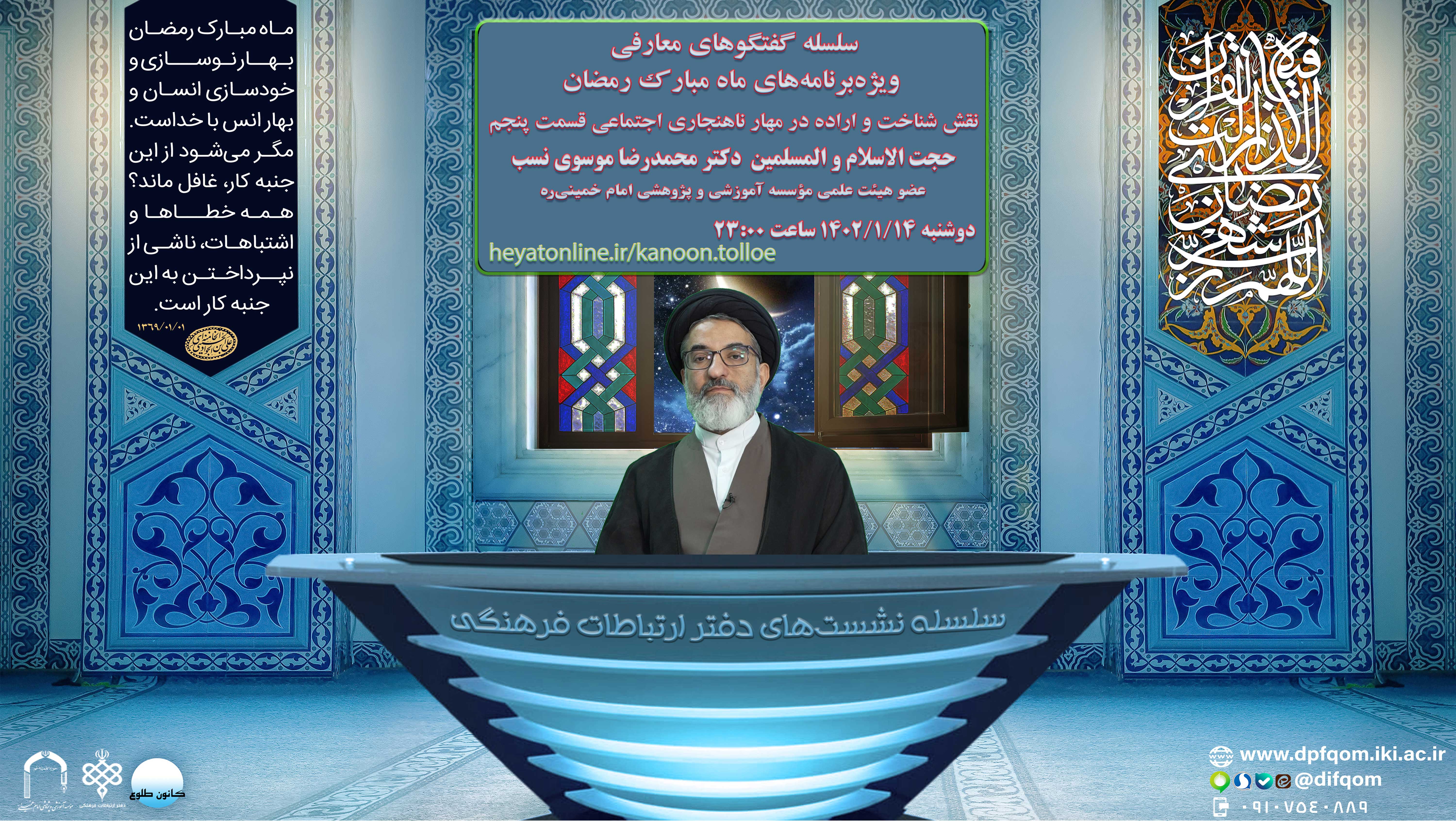 در این قسمت از سلسله مباحث تبیینی، موضوع "کمالجویی و هنجارهای اجتماعینقش شناخت و اراده در مهار ناهنجاری اجتماعی(قسمت پنجم)"، توسط حجت الاسلام دکترسیدمحمدرضا موسوینسب عضو هیئت علمی موسسه آموزشی و پژوهشی امام خمینیره مورد بحث قرار گرفته است.